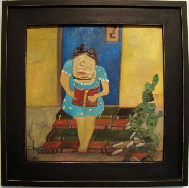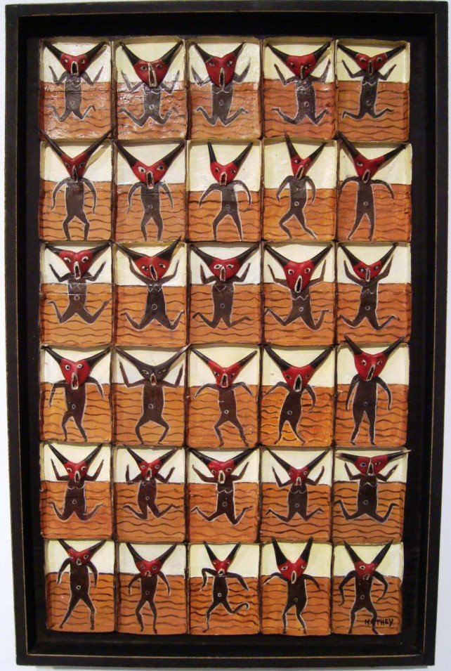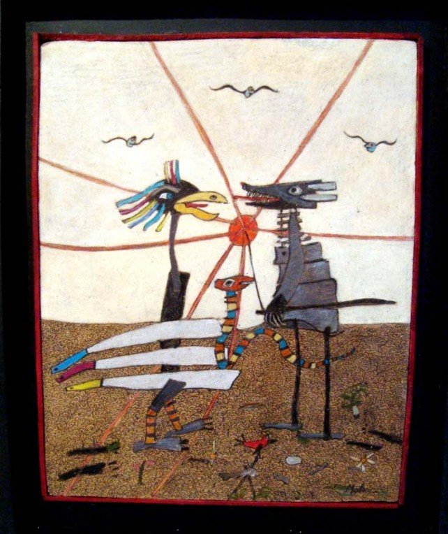 Claude’s sculptural works call to mind works by another French artist, Henri Gaudier-Brzeska or even Brancussi or Epstein. Her assemblage paintings are reminiscent of Dubuffet or Marc Caro and Jean-Pierre Jeunot’s fantastical imagination. Similarly to these artists, Mathey has intellectualized pop culture without demeaning high culture because of it. Best of all, her found objects are the discarded objects from her journey through Mexico: matchboxes, bottle caps, tin and aluminum cans, plastic water bottles – all magically transformed into some of the most original works of art.